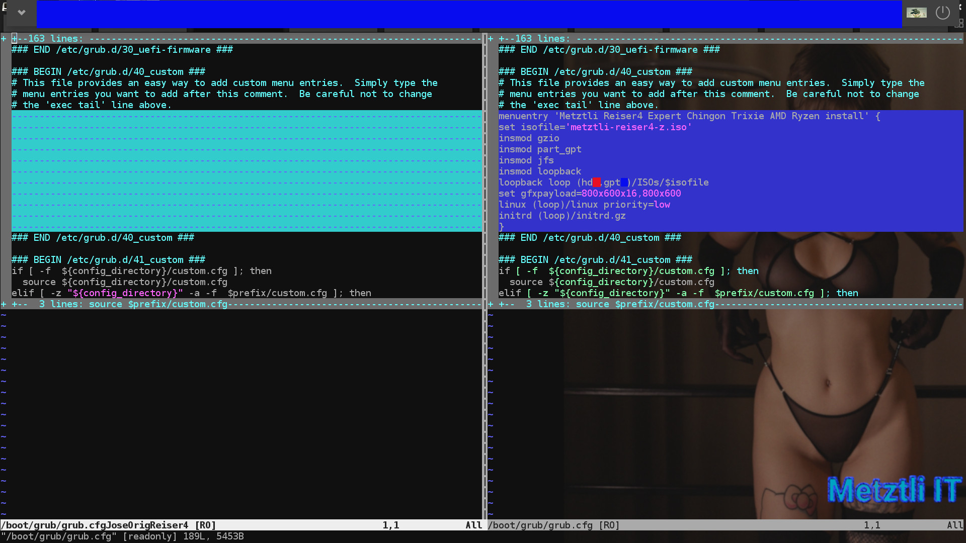 I began by modifyng the /etc/grub.d/40_custom file to specify the hard disk media and partition where our Metztli Reiser4 Z ISO/USB image was located: